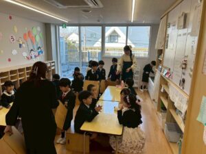 朝の様子みんな、胸の花をつけてもらっています!
