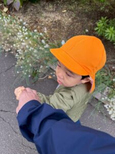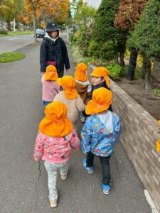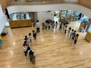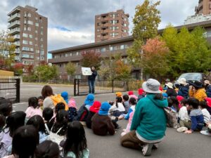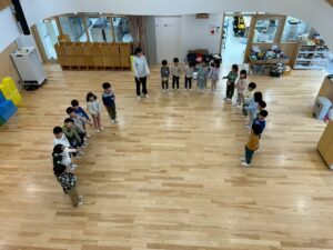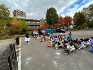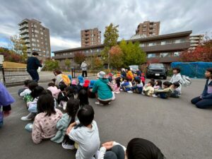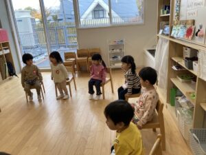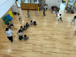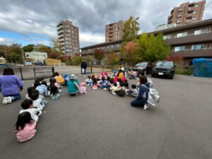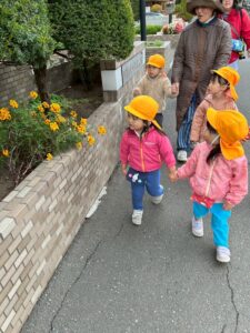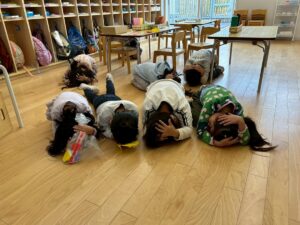 避難訓練 地震が来て、ダンゴムシポーズになり、逃げました!